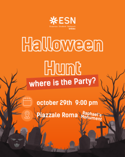 ESN Urbino vi da il benvenuto all'Halloween Hunt, una caccia al tesoro a tema Halloween dove verrete messi alla prova per risolvere una storia, una leggenda ricorrente per la città di Urbino…
