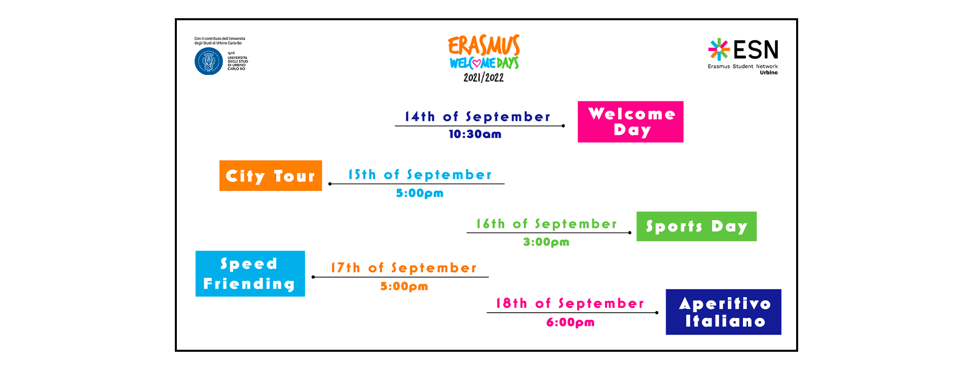 Per aprire una settimana ricca di eventi ed emozioni, noi di ESN Urbino vi aspettiamo al Welcome Day organizzato in collaborazione con l'Università degli Studi di Urbino Carlo Bo!